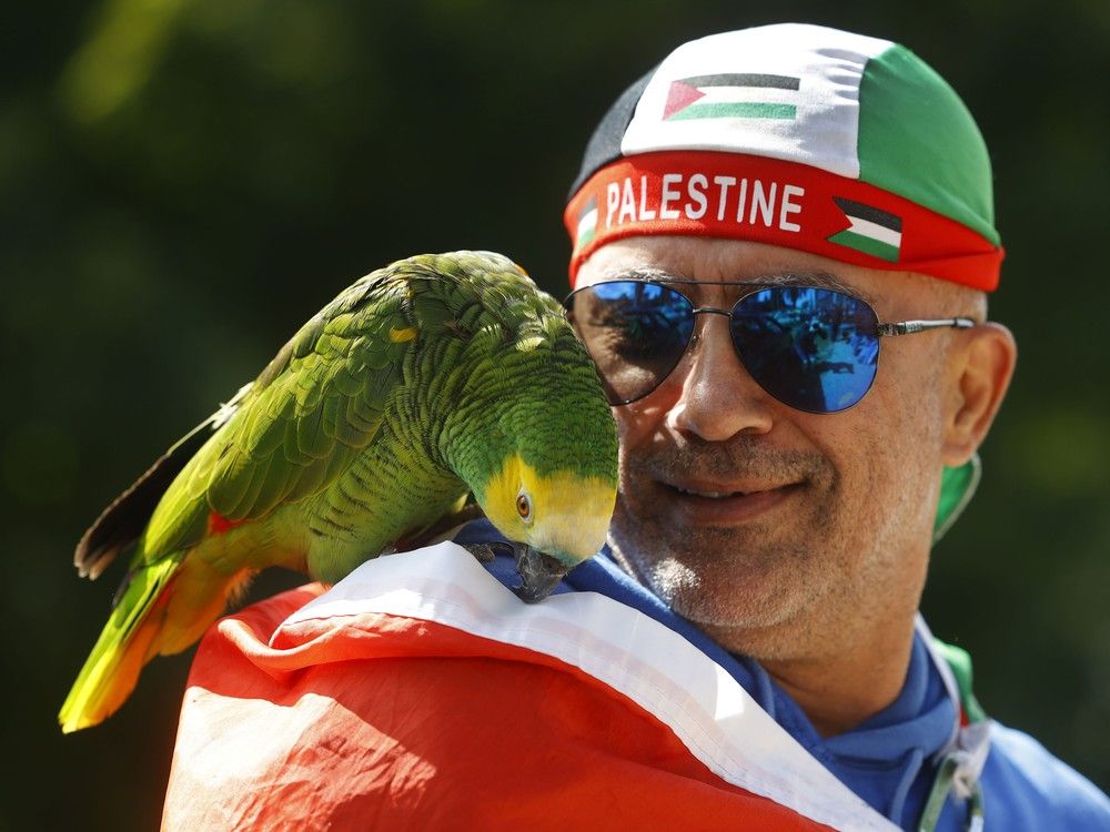 Reyad Abed et son perroquet CoCo ont assisté au défilé en soutien à la Palestine.